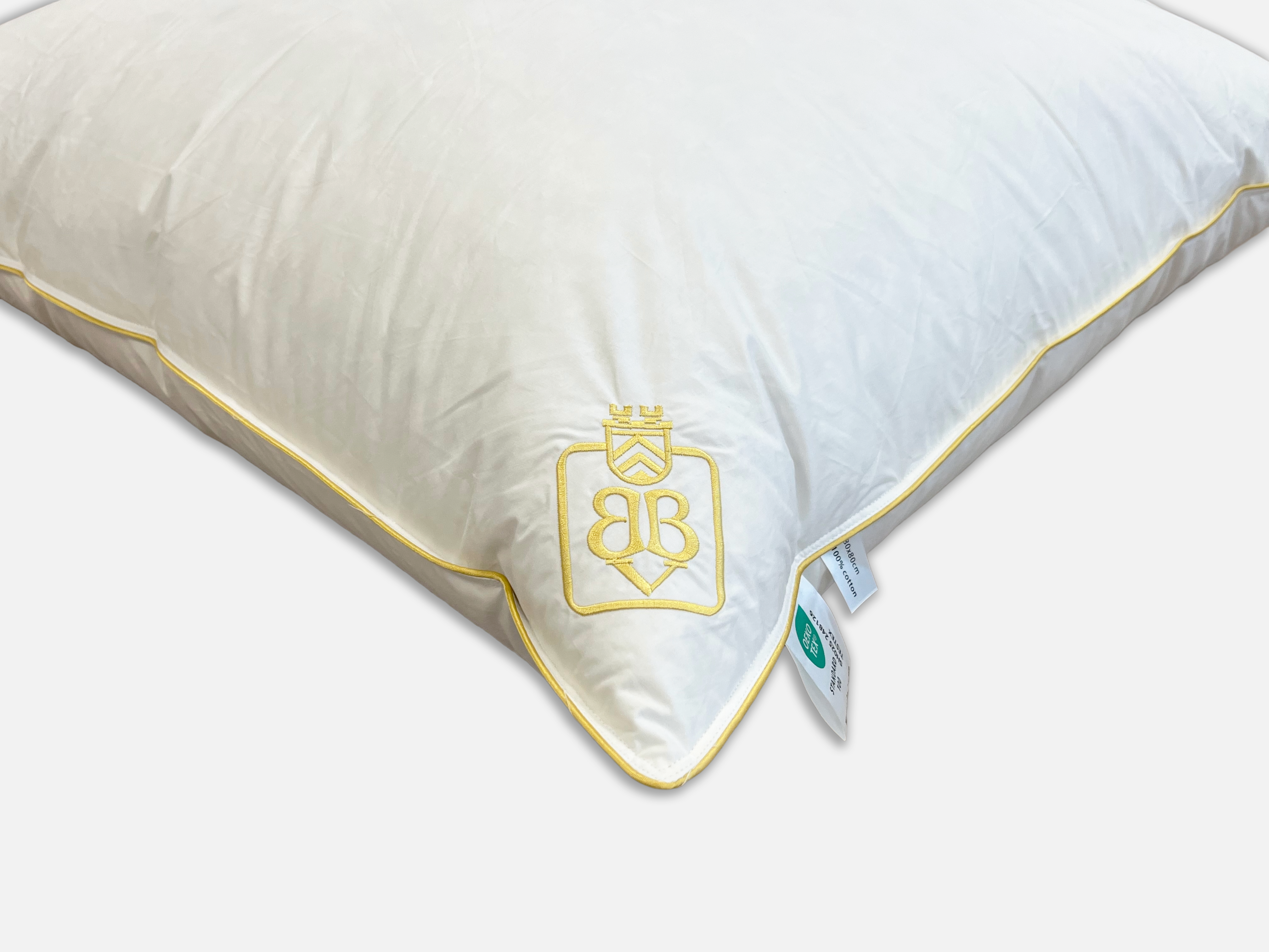 Arctica Premium Gold 3 Kammer-Kissen extra weich, Füllung außen: Weiße canadische neue Daunen und Federn, Klasse, 90% Daune 10% Federn; Füllung Innen für die Stützkraft: weiße canadische neue Federn, Klasse 1, 100% Feder, 100er Mako Dauneneinschütte, Gold-Biese, Gold-Stickerei, Hülle: 100% Baumwolle