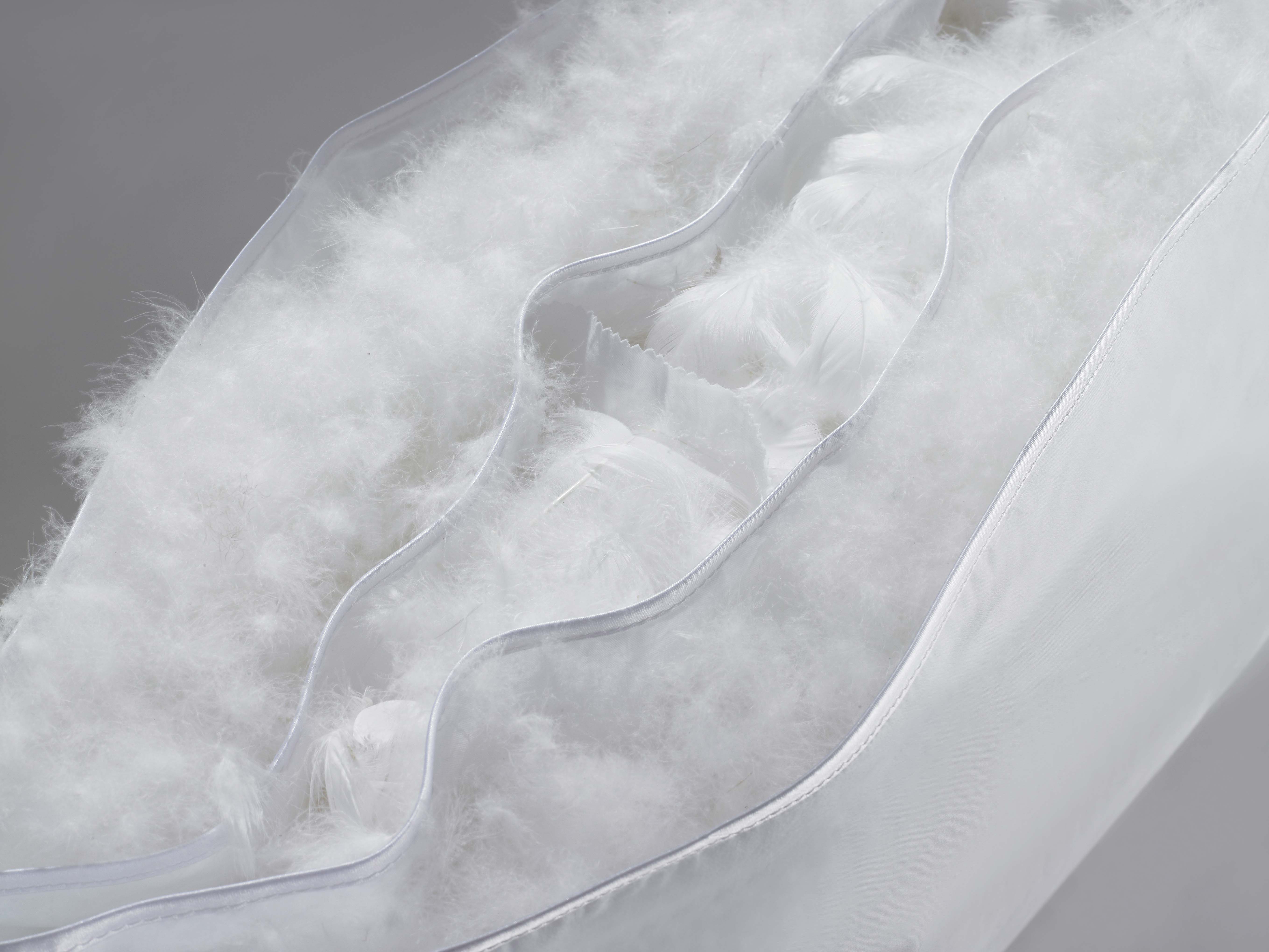 Die äußeren Kammern sind mit einer feinen Mischung aus 90 % Daunen und 10 % kleinen Federchen gefüllt. Diese verleihen dem Kissen eine angenehm weiche, anschmiegsame Oberfläche, die sich sanft an Kopf und Schultern anpasst. Im Inneren sorgen 100 % Federn in mehreren Stützzonen für eine stabile Form und gezielte Unterstützung des Nackenbereichs – ideal, um Verspannungen vorzubeugen und die Wirbelsäule in einer natürlichen Position zu halten. Der 5cm hohe Außensteg gibt genug Raum für die stützende Federn im Innenkern.